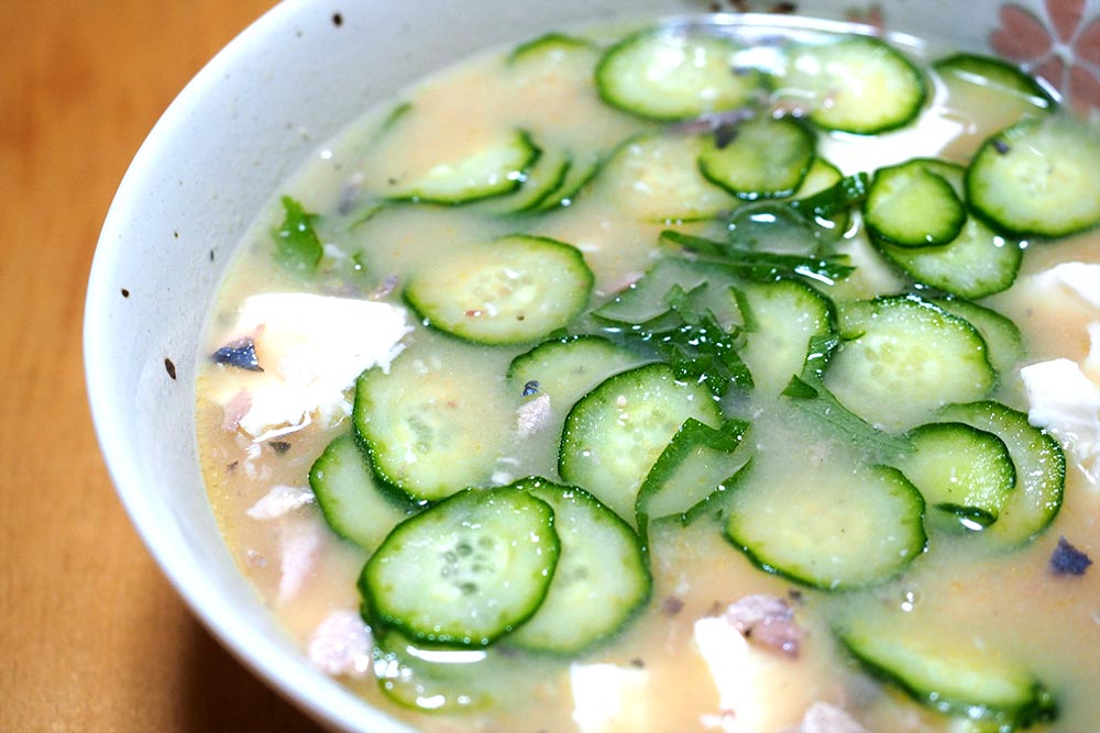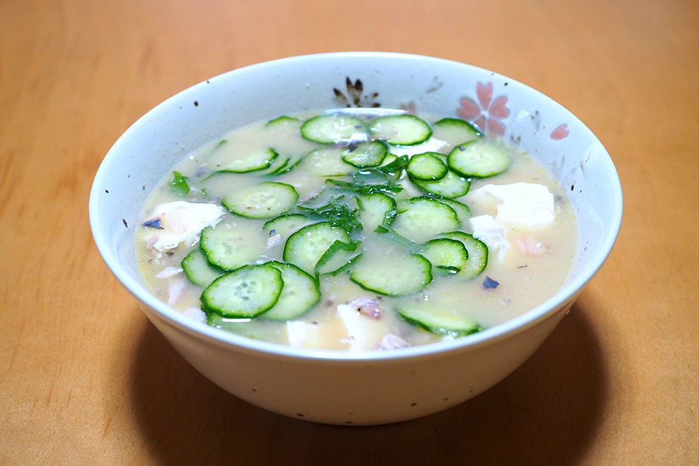 冷や汁ってもともと郷土料理というか家庭料理なので、入れる具材はそれぞれの家庭で微妙に違います。豆腐とキュウリ以外は家庭やお店によってマチマチです。