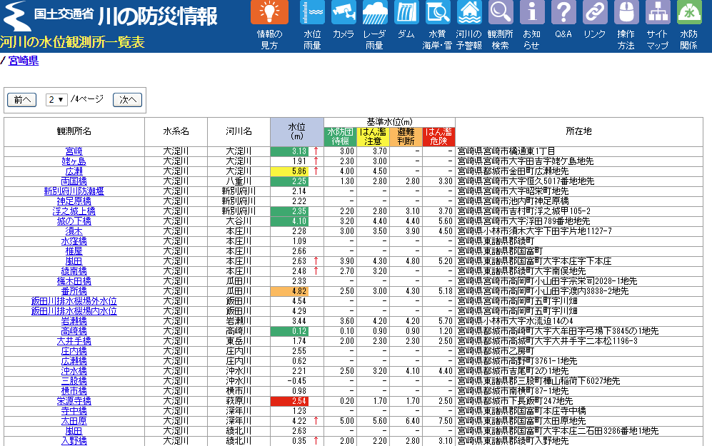 一覧で宮崎県内の河川の状況(水位)を見る事ができます。